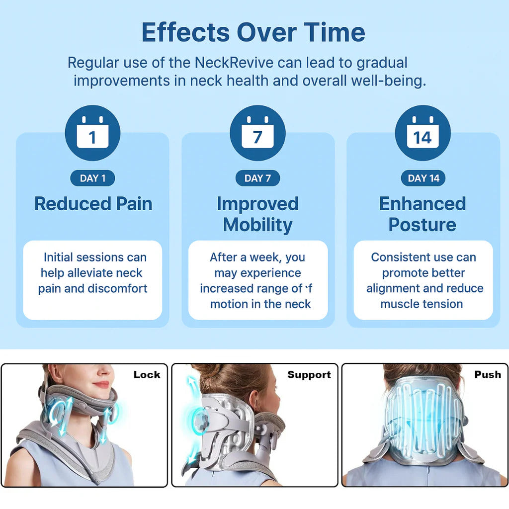 ReNeck Triple-R využívá trakční cvičení k protažení zad v optimálním úhlu 26° , což dává napjatým krčním svalům zasloužený odpočinek k uvolnění, obnovení rytmu a úlevě od napjatých, zanícených nervů způsobených roky nahromaděného škodlivého tlaku.
