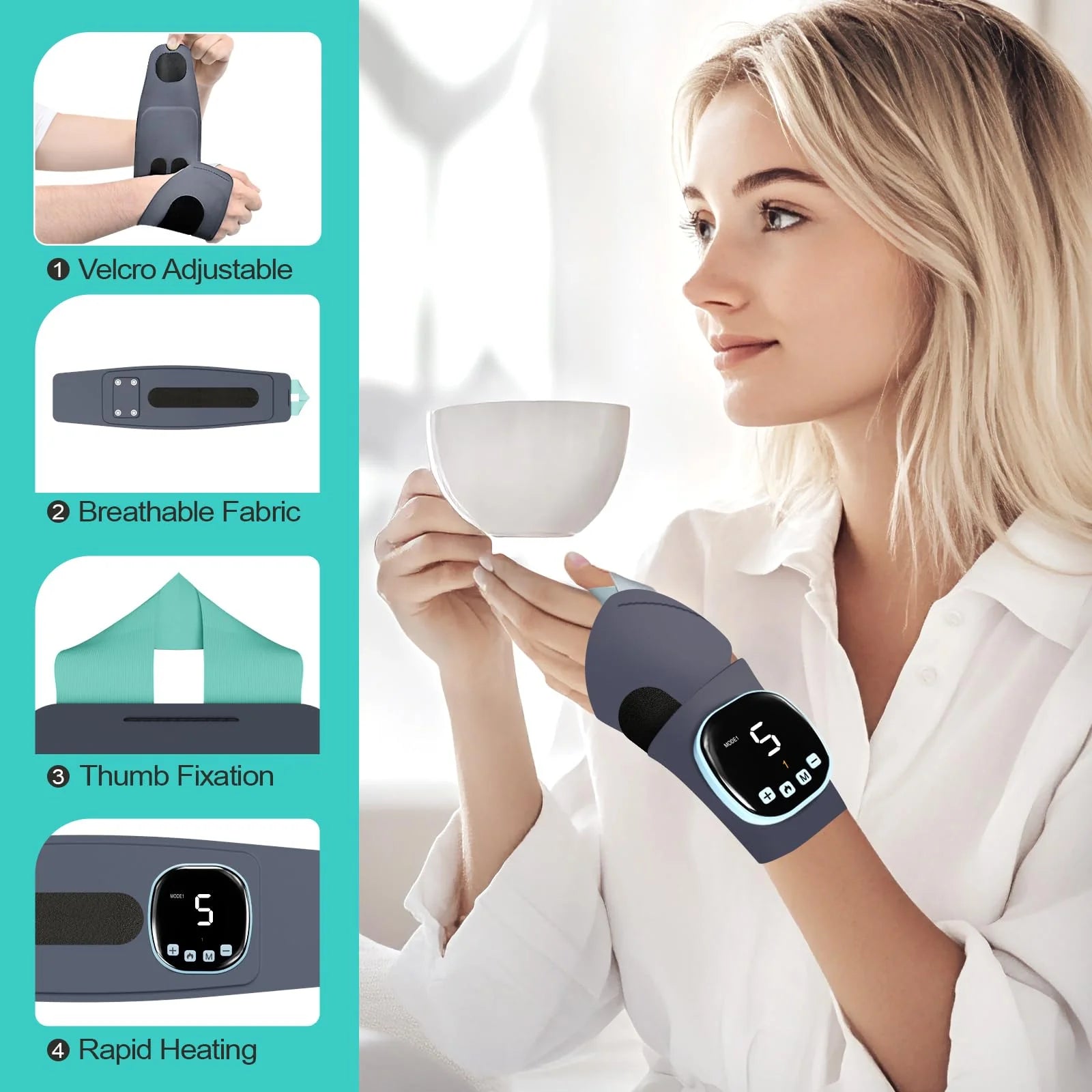 Tato ortéza na zápěstí mi opravdu pomohla s bolestí zápěstí. Teplo je skvělé a líbí se mi, že má 3 nastavení teploty. Funkce masáže a pulsu jsou super relaxační a díky tolika úrovním a režimům si je můžu přizpůsobit přesně podle sebe.