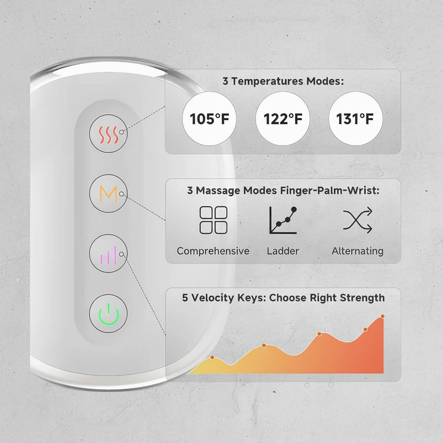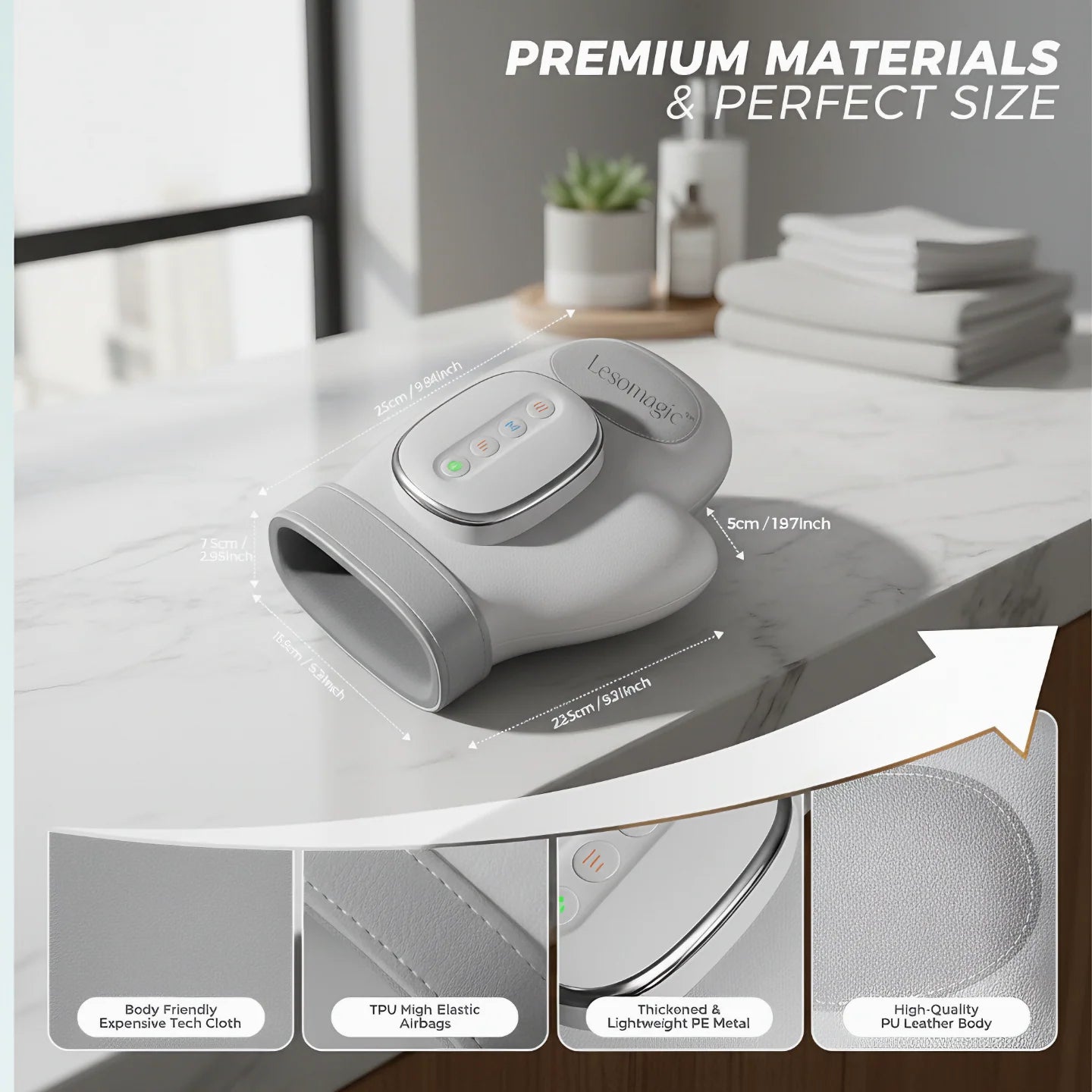 Používání ručního masážního přístroje Lesomagic™ po dobu 15 minut denně jemně uvolní napjaté nervy, zvýší krevní oběh, uleví od ztuhlosti a obnoví přirozenou flexibilitu způsobenou únavou rukou nebo natažením prstů. Přístroj funguje kombinací výhod uklidňujícího tepla, inteligentní komprese a přesné shiatsu masáže.